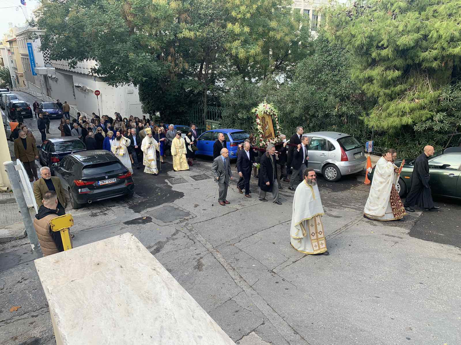 Στο τέλος της Θείας Λειτουργίας ο κ. Συμεών προσέφερε στον Ιερό Ναό του Αγίου Νικολάου μία φορητή εικόνα του Οσίου Βησσαρίωνος του Αγαθωνίτου. Ο Προϊστάμενος του Ναού, Αιδεσιμολογιώτατος Πρωτ. π. Βασίλειος Βολουδάκης αναφέρθηκε με πολύ θερμά λόγια αγάπης προς το πρόσωπο του Σεβασμιωτάτου κ. Συμεών ανατρέχοντας ιδιαίτερα στην περίοδο της διακονίας του κ. Συμεών ως Πρωτοσυγκέλλου της Ιεράς Αρχιεπισκοπής Αθηνών κατά την οποία ο κ. Συμεών «επέδειξε ιδιαίτερη φροντίδα για τον Ναό του Αγίου Νικολάου», ενώ ο π. Βασίλειος τόνισε ότι ο Σεβασμιώτατος Φθιώτιδος κ. Συμεών είναι «ο πρώτος επίσκοπος που ιερουργεί στο Ναό του Αγίου Νικολάου στην μετα covid εποχή».