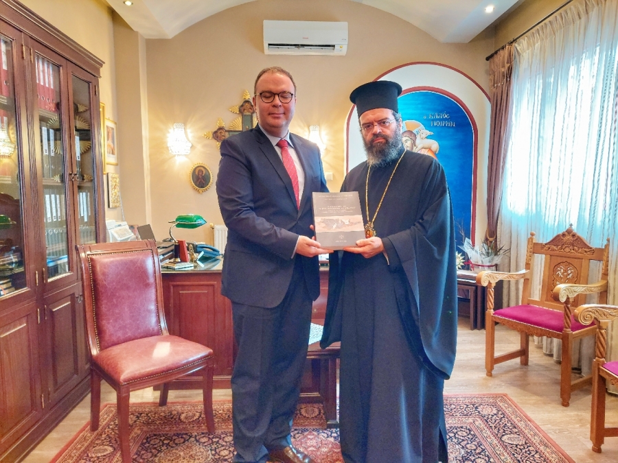 Ὁ Σεβασμιώτατος τὸν καλωσόρισε καὶ τοῦ πρροσέφερε ὡς ἐνθύμημα τῆς ἐπισκέψεως τὸ βιβλίο τῶν ἐκδόσεων τῆς Μητροπόλεως «Τὸ Παπίκιον Ὄρος καὶ ἡ Ἰβηρική Ἀριστοκρατία τοῦ Βυζαντίου».