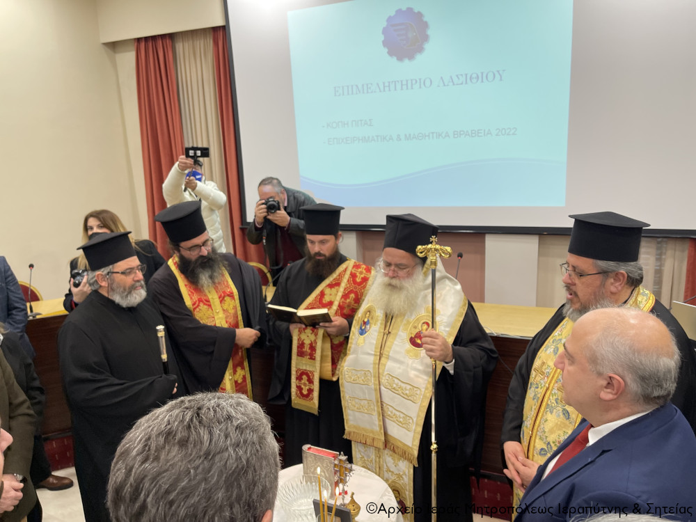 Ο Μητροπολίτης Ιεραπύτνης και Σητείας κ. Κύριλλος, κατόπιν κανονικής άδειας του οικείου Μητροπολίτου Πέτρας και Χερρονήσου κ. Γερασίμου, ανταποκρινόμενος στην πρόσκληση του Προέδρου κ. Θωμά Χαριτάκη, τέλεσε τον αγιασμό και ευλόγησε την Βασιλόπιτα στο Επιμελητήριο Λασιθίου, την οποία έκοψε ο Πρόεδρος. Ο Σεβ. ευχαρίστησε τον Πρόεδρο για την πρόσκληση και ευχήθηκε ευλογημένη από τον Κύριο χρονιά, δημιουργική και παραγωγική, με αγάπη, ομοψυχία, ελπίδα και ενότητα για την ουσιαστική ανάπτυξη του Νομού Λασιθίου.