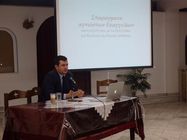 Ομιλητής ήταν ο κ. Βασίλειος Τζέρπος, διδάκτωρ θεολογίας. Στην ομιλία ο ομιλητής αναφέρθηκε στη συλλογή των βιβλίων της Καινής Διαθήκης, στις πηγές του κανόνα αυτής και στην ιστορία των απόκρυφων κειμένων της Καινής Διαθήκης ή αντικανονικών. Κατά τη διάρκεια της ομιλίας παρουσιάσθηκαν εικόνες από σπαράγματα παπύρων που έχουν βρεθεί ανά τους αιώνες και στα οποία αναφέρονται φράσεις από την Καινή Διαθήκη.