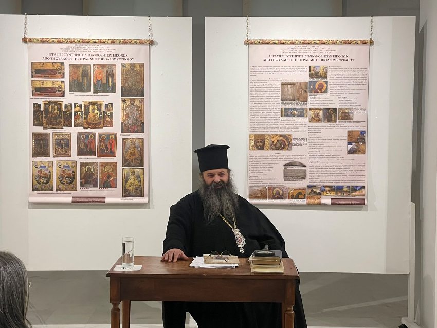 Στο πλαίσιο της εκθέσεως Μεταβυζαντινών Εικόνων από την συλλογή της Ι. Μητροπόλεως μας στην Δημοτική Πινακοθήκη Κορίνθου με τίτλο: «ΕΡΓΟΝ ΘΕΙΟΝ», και με τις ευλογίες του Σεβασμιωτάτου Ποιμενάρχου μας κ. Διονυσίου, πραγματοποιήθηκε χθες, 12ην Μαρτίου 2025, στον ως άνω χώρο ομιλία από τον Θεοφιλέστατο Επίσκοπο Κεγχρεών κ. Αγάπιο με θέμα: «Δια των Εικόνων τα όμματα των ορώντων αγιάζονται, ο δε νους αυτών ανάγεται προς θεογνωσίαν, ώσπερ και δι᾽ άλλων κειμηλίων».