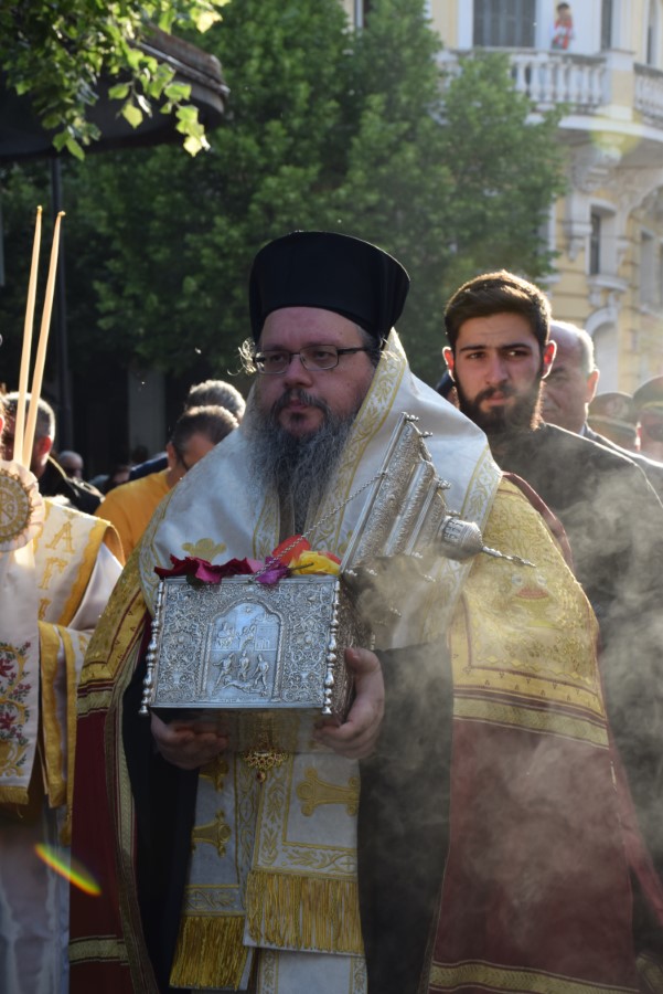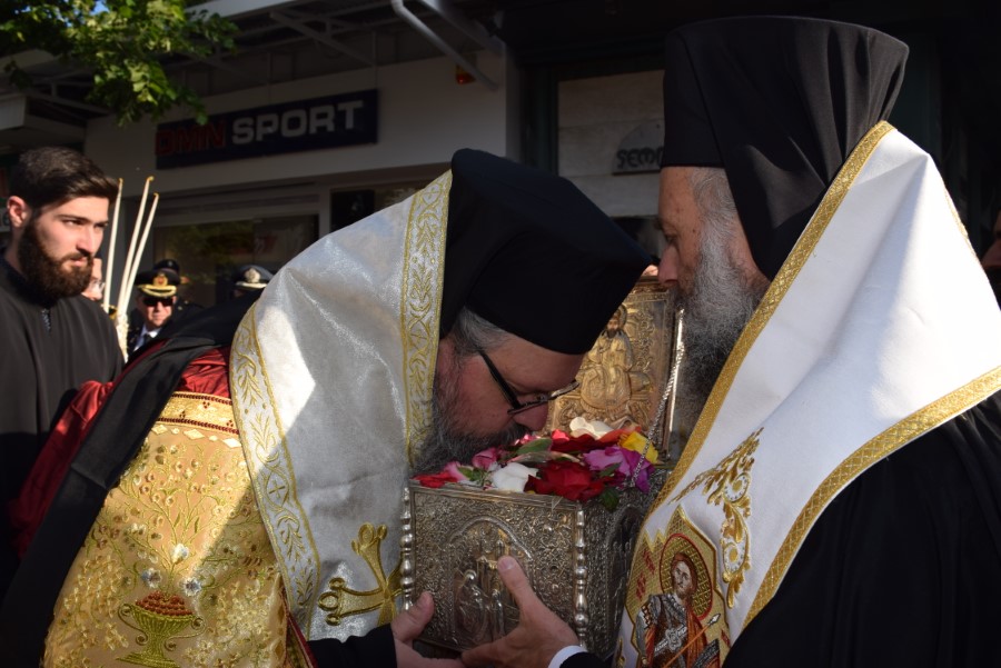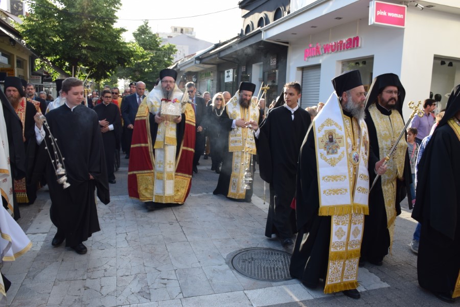 Ακολούθησε, η λιτανευτική πομπή της ιεράς εικόνος και της τιμίας κάρας του Αγίου μας μέχρι και την κεντρική πλατεία της πόλεώς.