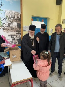 Ο Σεβασμιώτατος με την ευκαιρία αυτή μοίρασε σχολικά είδη στους μαθητές των Δημοτικών Σχολείων και παιχνίδια στα νήπια. Επίσης είχε τη δυνατότητα να επικοινωνήσει με τους εκπαιδευτικούς και τους μαθητές και να τους εκδηλώσει το αμέριστο ενδιαφέρον του για την πρόοδο των παιδιών και να ευχηθεί στους μεν εκπαιδευτικούς υπομονή και όρεξη για προσφορά στους δε μικρούς μαθητές φώτιση Θεού και επιτυχία.