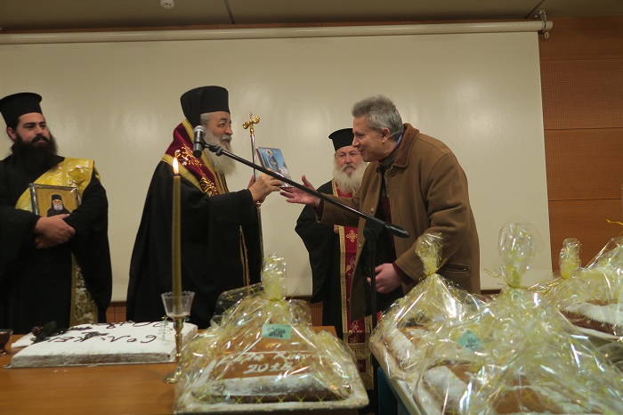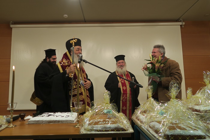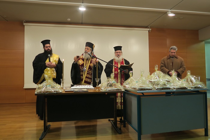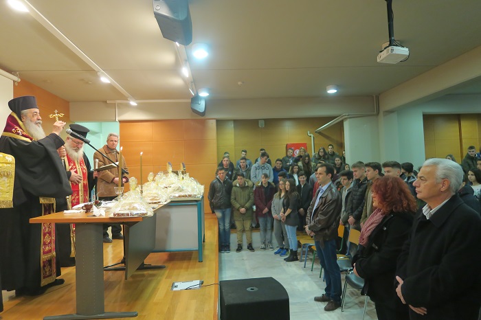 Η τελετή έλαβε χώρα στην αίθουσα τελετών του σχολείου και στο τέλος ο Σεβασμιώτατος ωμίλησε στα παιδιά για την σημασία της αγιοβασιλόπιτας, για την προσωπικότητα του αγίου Βασιλείου, το Φιλανθρωπικό του έργο καθώς και το σπουδαίο έργο των Προστατών της Παιδείας Τριών Ιεραρχών, οι οποίοι ανέδειξαν και συνεχίζουν με το έργο τους να αναδεικνύουν την αξία του Ελληνοχριστιανικού πολιτισμού. Παρότρυνε δε τους καθηγητές και μαθητές την ημέρα της μνήμης τους να αποδώσουν με τον Εκκλησιασμό τους την οφειλομένη τιμή και σεβασμό τους προς τους Οικουμενικούς Πατέρας και Διδασκάλους, Τρείς Ιεράρχας.