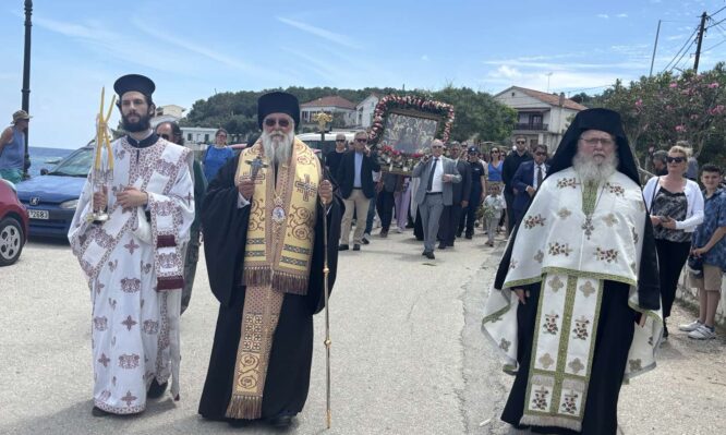 Ο Σεβασμιώτατος ευλόγησε τους παρισταμένους με την τέλεση του Αγιασμού, ενώ με τη συμμετοχή σχολείων και φιλαρμονικών, η λιτανεία συνεχίστηκε παραλιακά έως το πλοίο. Κλήρος, λαός και τοπικοί άρχοντες συνόδευσαν την πομπή.
