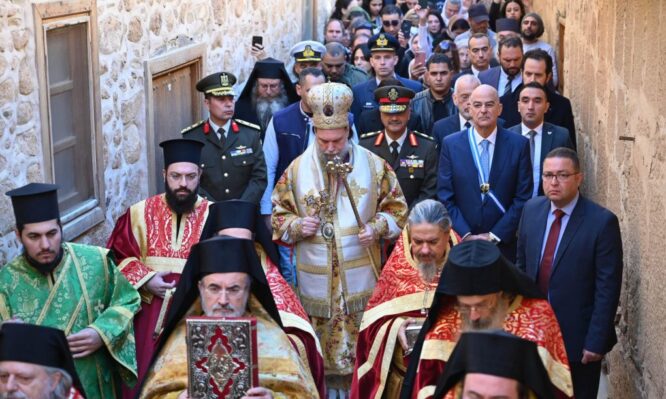 Μετά το πέρας της Θείας Λειτουργίας, ο Σεβασμιώτατος Αρχιεπίσκοπος Σινά τίμησε τον Υπουργό Εθνικής Άμυνας της πατρίδας μας κ. Νικόλαο Δένδια, προσφέροντάς του το παράσημο της Πολιούχου του Σινά Μεγαλομάρτυρος Αγίας Αικατερίνης.