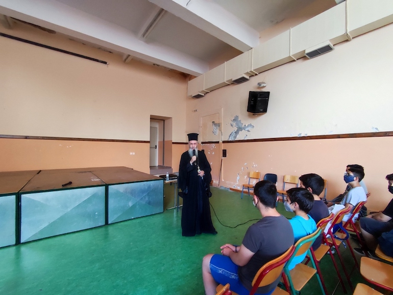 Ο κ. Ιερόθεος συνομίλησε για περίπου δύο ώρες με τα παιδιά στην αίθουσα εκδηλώσεων του Σχολείου, παρουσία των καθηγητών τους και απάντησε στις ερωτήσεις που του έθεσαν.