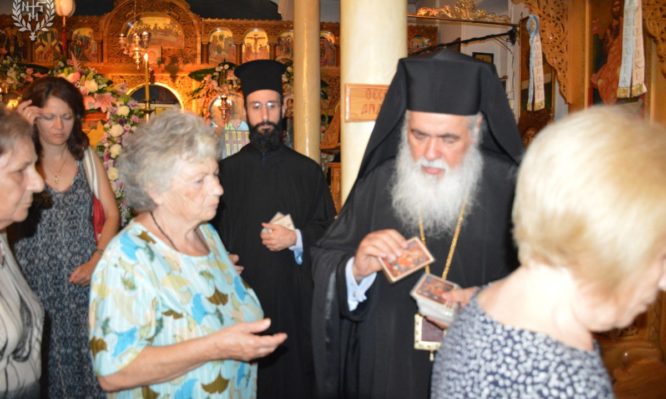 Ο Σεβασμιώτατος εστίασε ιδιαίτερα στο γεγονός της Μετάστασης της Παναγίας Μητέρας. Η Παναγία με τη Μετάσταση Της ανοίγει ένα παράθυρο στην Βασιλεία των Ουρανών, στην έβδομη ημέρα: «Χαίρε, αυγή μυστικής ημέρας».