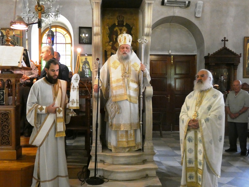 Κατά την άφιξή του στον Ιερό Ναό, ο Σεβασμιώτατος κόμισε τεμάχιο Ιερού Λειψάνου της Τιμίας Χειρός του Οσίου Πατρός ημών Ιωσήφ του Ησυχαστού και Σπηλαιώτου, του εκ Λευκών Πάρου καταγομένου. Ακολούθως χοροστάτησε στον Όρθρο και εν συνεχεία προεξήρχε της Θείας Λειτουργίας, πλαισιούμενος από τον οικείο Εφημέριο και Αρχιερατικό Επίτροπο Υρίας, Πρωτοπρ. Γεώργιο Τριαντάφυλλο και τον Διάκονο Παναγιώτη Σιαχάμη.