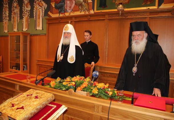 Η Ιερά Σύνοδος, απένειμε στον Πατριάρχη Κύριλλο την ύψιστη τιμητική διάκριση της Εκκλησίας μας, τον Μεγαλόσταυρο του Απόστολου Παύλου. Στα μέλη της Συνοδείας του Ρώσου Πατριάρχη απονεμήθηκε ο Χρυσός Σταυρός του Αποστόλου Παύλου.