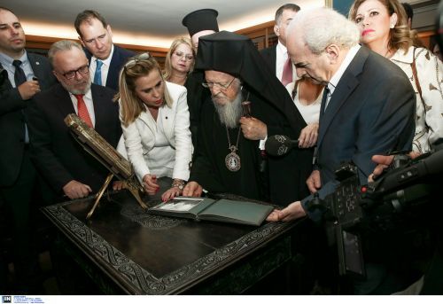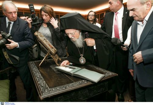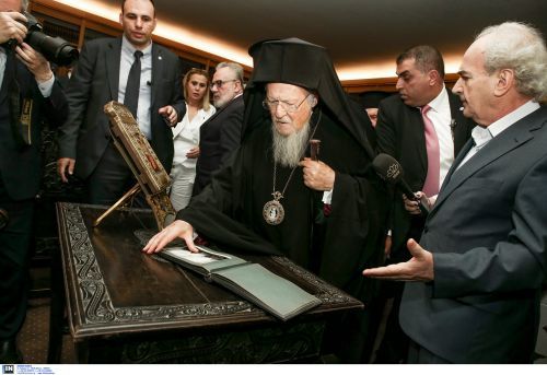 Τον Παναγιώτατο υποδέχτηκε το προεδρείο της Ενωσης Συντακτών, ενώ στο χαιρετισμό του ο συγγραφέας Βασίλης Βασιλικός τον χαρακτήρισε «πράσινο Πατριάρχης».