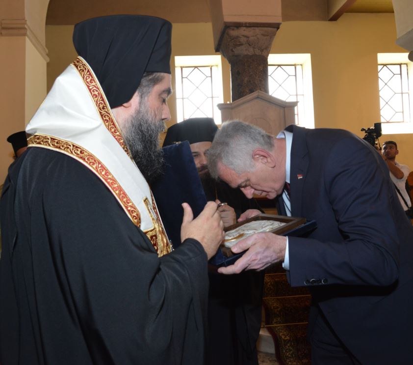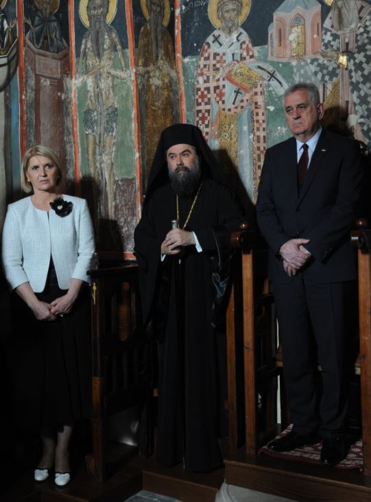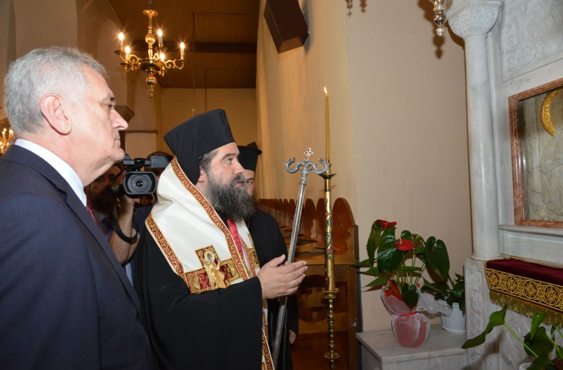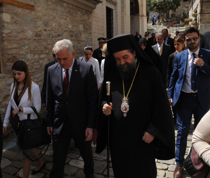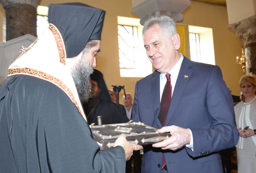 Ο Εξοχώτατος Πρόεδρος κ. Νίκολιτς ευχαρίστησε εγκαρδίως τον Σεβασμιώτατο για την υποδοχή, εξέφρασε τον θαυμασμό του για την πίστη, την ιστορία, τον πολιτισμό και τα μνημεία της περιοχής μας, ως ο βυζαντινός Ναός των Αγίων Θεοδώρων Σερρών και ετόνισε και εκείνος τους ισχυρούς δεσμούς πίστεως και ιστορίας που συνδέουν τους δύο λα-ούς μας. Ακολούθως προσέφερε στον Σεβ. Ποιμενάρχη Σερρών ένα πιστό αντίγραφο του περγαμηνού κώδικα του Σέρβου αυτοκράτορα Στεφάνου Δουσάν, μέρος του οποίου, ὀπως είπε, γράφτηκε από τον Σέρβο ηγεμόνα στην πόλη των Σερρών.