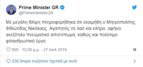«Με μεγάλη θλίψη πληροφορήθηκα ότι εκοιμήθη ο Μητροπολίτης Φθιώτιδας Νικόλαος»,αναφέρει ο πρωθυπουργός και καταλήγει: «Αγαπητός σε λαό και κλήρο, αφήνει ανεξίτηλο πνευματικό αποτύπωμα, καθώς και πολύτιμο φιλανθρωπικό έργο».