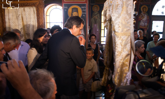 Την Θεία Λειτουργία παρακολούθησε ο Πρωθυπουργός της χώρας Αντώνης Σαμαράς, συνοδευόμενος από συνεργάτες του αλλά και τοπικούς άρχοντες.