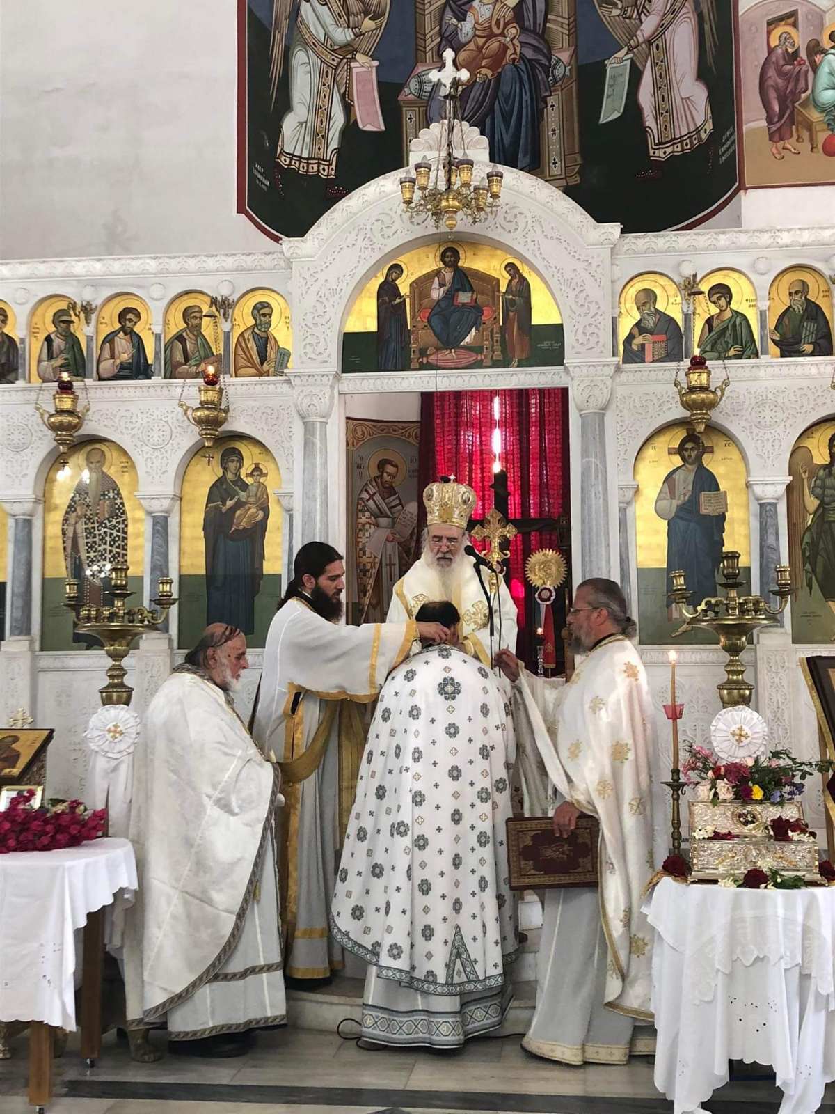 Την Παρασκευήν 15η Ιουλίου 2022 ελειτούργησε στον πανηγυρίζοντα Ιερό Ναό Αγίων Μαρτύρων Κηρύκου και Ιουλίττης, όπου εχειροτόνησε τον Διάκονο π. Κωνσταντίνον Μαρτίνην εις Πρεσβύτερον και απένειμε το οφφίκιον του Πρωτοπρεσβυτέρου εις τον π. Φίλιππον Πούλον, Εφημέριον Παναγίας Αγίου Κηρύκου και άλλων κενών Ενοριών. Μετά το πέρας της πανηγυρικής θείας Λειτουργίας, ετέλεσε τρισάγιον επί του τάφου του Μακαριστού Προκατόχου του Νεοφύτου Κοτζμανίδου, διατελέσαντος Μητροπολίτου Ικαρίας, εις την προσωποπαγή Μητρόπολιν Ικαρίας, η οποία δημιουργήθηκε τότε, προς τακτοποίησιν των εμπεριστάτων, εκ της Μικρασιατικής Καταστροφής, Επισκόπων.