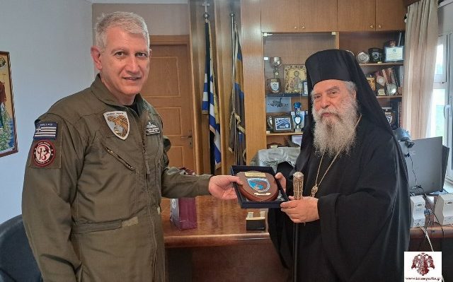 Κατά τη διάρκεια της παραμονής του στην αρκαδική πρωτεύουσα, ο σεπτός Ποιμενάρχης μας, συνοδευόμενος από τον Θεοφιλέστατο Επίσκοπο Τεγέας κ. Θεόκλητο, επισκέφθηκε εθιμοτυπικά την 124 Πτέρυγα Βασικής Εκπαίδευσης, όπου τον υποδέχθηκε ο Διοικητής  Σμήναρχος Γρηγόριος Διόλατζης. Ως ενθύμιο της επίσκεψης, ο Διοικητής  της 124 Π.Β.Ε. πρόσφερε στον Σεβασμιώτατο μία πλακέτα της Πολεμικής Αεροπορίας.