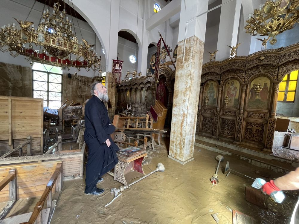 Δόξασε το Θεό που δεν είχαμε ανθρώπινα θύματα και μετέδωσε κλίμα αισιοδοξίας και τόνισε ιδιαιτέρως την αποφασιστικότητα να αποκατασταθούν οι ζημιές τάχιστα και ενημέρωσε τους εφημερίους για την άμεση αποκατάσταση από συνεργεία καθαριότητας που θα διαθέσει η Ιερά Μητρόπολη.