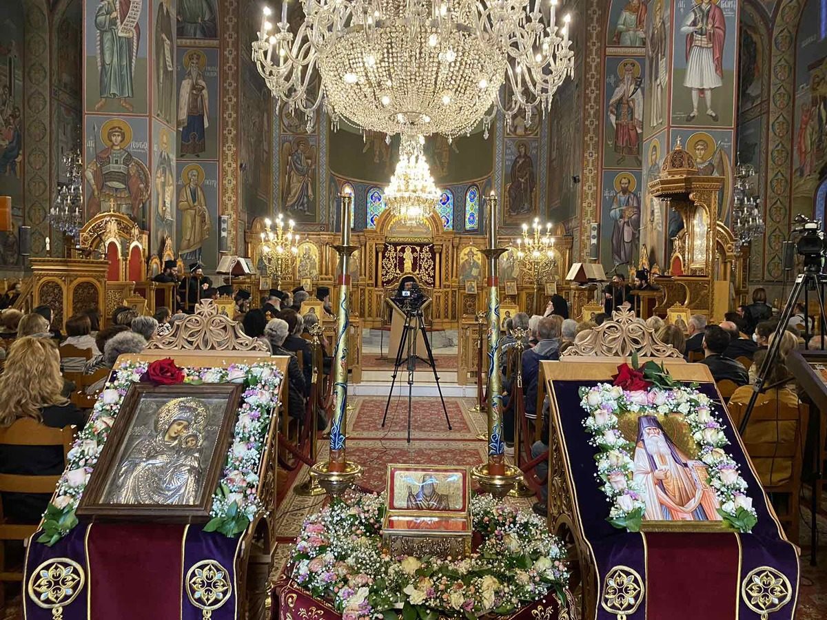 Τα ιερά σεβάσματα κόμισε ο Ποιμενάρχης της ακριτικής, μυροβόλου, Αγιοτόκου και μαρτυρικής νήσου, Σεβ. Μητροπολίτης Χίου, Ψαρών & Οινουσσών κ. Μάρκος, και τα υποδέχθηκε επισήμως, ο Σεβ. Μητροπολίτης Δημητριάδος κ. Ιγνάτιος, επικεφαλής Κλήρου και λαού.
