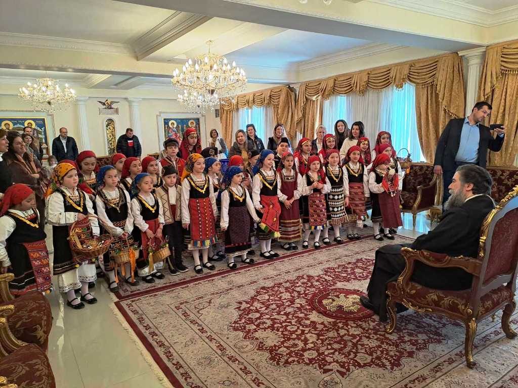 Ο Σεβασμιώτατος υποδέχθηκε τα 60 και πλέον παιδιά, συνοδευόμενα από τα μέλη των ως είρηται Συλλόγων και άκουσε από τους μικρούς αγγελιοφόρους της Αναστάσεως τα παραδοσιακά κάλαντα.
