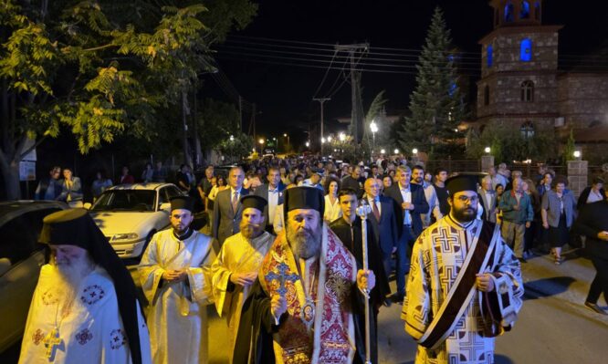 Μετά το πέρας της ιεράς ακολουθίας, πραγματοποιήθηκε η καθιερωμένη λιτάνευση της Ιεράς Εικόνας των Αγίων Νεομαρτύρων στους δρόμους της ενορίας. Με τη συμμετοχή κλήρου και λαού, η πόλη γέμισε από ύμνους και δεήσεις, σκορπίζοντας πνευματική αγαλλίαση και συγκίνηση. Η πομπή στάθηκε ως ζωντανή μαρτυρία πίστεως και ενότητας, θυμίζοντας σε όλους ότι οι Άγιοι συνεχίζουν να φωτίζουν με το παράδειγμά τους το παρόν και να εμπνέουν το μέλλον της τοπικής Εκκλησίας.