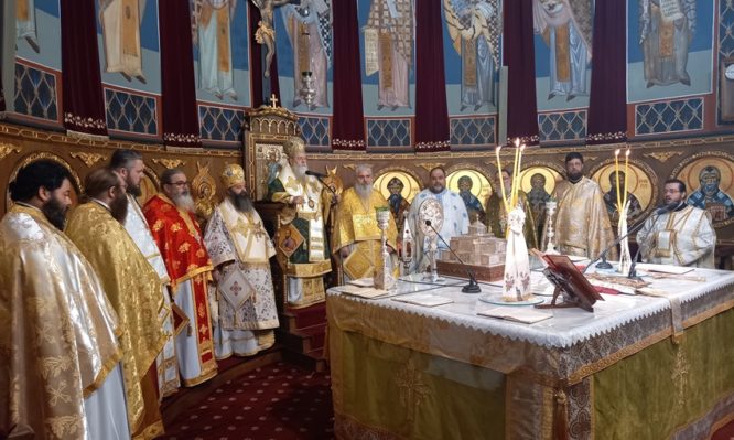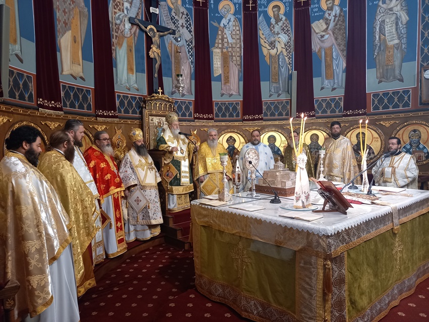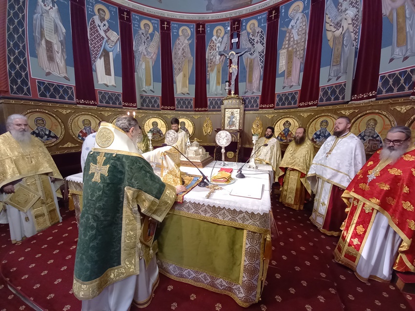 Η ημέρα ξεκίνησε με την καθιερωμένη προς τιμήν των Αγίων Αποστόλων και συνεργών του Απ. Παύλου, Ακύλα και Πρισκίλλης, προστατών του θεσμού της συζυγίας, Δισαρχιερατική Θ. Λειτουργία, προεξάρχοντος του Σεβασμιωτάτου Μητροπολίτου μας κ. Διονυσίου και συνιερουργούντος του Θεοφιλεστάτου Πρωτοσυγκέλλου της Ι. Μητροπόλεως μας Επισκόπου Κεγχρεών κ. Αγαπίου, αφού προηγουμένως μετεφέρθησαν τα εις το Επισκοπείο φυλασσόμενα αποτμήματα εκ των Ι. Λειψάνων του Αγίου Αποστόλου Ακύλα μετά πάσης τιμής και ευλαβείας και τα οποία καθ᾿όλην την διάρκεια της Ι. Ακολουθίας εξετέθησαν εις προσκύνησιν υπό των παρισταμένων πιστών.