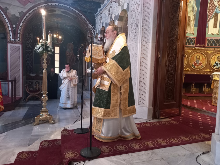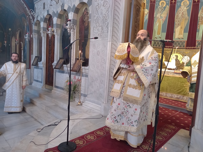 Ο Σεβ. Μητροπολίτης ομίλησε για τους τιμώμενους Αγίους Ακύλα και Πρίσκιλλα, οι οποίοι ήταν Ιουδαίοι από τον Πόντο και αναγκάστηκαν να φύγουν από την Ρώμη,όπου έμεναν,κατά τον διωγμό του Αυτοκράτορα Κλαυδίου και να έρθουν στην Κόρινθο. Ο Απόστολος Παύλος, ερχόμενος από την Αθήνα στην Κόρινθο για να κηρύξει, φιλοξενήθηκε απ’ αυτό το άγιο ζευγάρι,που από σκηνοποιοί μετεβλήθησαν σε συνεργάτες Του στον Ευαγγελισμό του λαού και μαζί τους ήταν, όταν διενεργώντας τον πρώτο έρανο,την περίφημη «λογία», για την ενίσχυση των Ιεροσολύμων και κατηγορούμενος για φιλαργυρίαανεφώνησε«ἀργυρίου ἢ χρυσίου ἢ ἱματισμοῦοὐδενὸςἐπεθύμησα·αὐτοὶ γινώσκετε ὅτιταῖςχρείαις μου καὶτοῖςοὖσιμετ᾿ἐμοῦὑπηρέτησαναἱχεῖρεςαὗται» (Πραξ. κ’, 33-34). Ο Απόστολος Παύλος δίδαξε ότι Χριστιανός και Εκκλησία χωρίς έργα αγάπης δεν υφίστανται και οι Άγιοι Απόστολοι Ακύλας και Πρίσκιλλα, ακολούθησαν με πιστότητα και εφήρμοσαν όλα, όσα Εκείνος δίδαξε. Σήμερα, που ψάχνουμε εναγωνίως πρότυπα αγάπης και Χριστιανικής συζυγικής ζωήςοιΆγιοι Απόστολοι Ακύλας και Πρίσκιλλαμπορούν να αποτελέσουν τα ιδανικά πρότυπα και να αλλάξουν τον τρόπο σκέψης της κοινωνίαςμας,κάνοντας μας να αναρωτηθούμε που «πηγαίνουμε», που «φτάσαμε», και που στοχεύουν να μας πάνε ακόμα,όσοι προσπαθούν διακαώς να αντικαταστήσουν την πνευματικότητα και το συναίσθημα με τον υλισμό και την τεχνίτη νοημοσύνη.