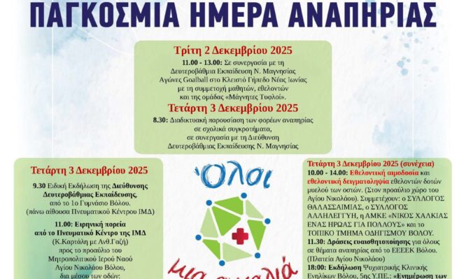 Το Δίκτυο Φορέων Υγείας Μαγνησίας που συντονίζεται από την Ιερά Μητρόπολη Δημητριάδος, ανακοινώνει για μία ακόμη χρονιά το πρόγραμμα Εκδηλώσεων για την Παγκόσμια Ημέρα Αναπηρίας. Μέσα από αυτήν την κοινή μας προσπάθεια, εδώ και χρόνια προσπαθούμε να αναδείξουμε τη σημασία της συμπερίληψης, της ευαισθητοποίησης και της αλληλεγγύης προς τα άτομα με αναπηρία.
