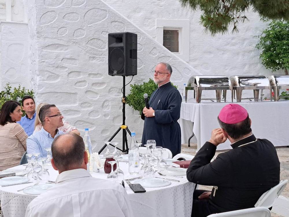 Ήταν ξεχωριστή γιά όλους τους συμμετέχοντες η βραδυά τού Σαββάτου 10 Ιουνίου. Με αυτήν την ζεστή και τρυφερή οικογενειακή γιορτή έκλεισε ο φετινός κύκλος τών εργασιών τού Σχολείου Οικογένειας τής Ιεράς Μητροπόλεως Σύρου. Ήταν μιά όμορφη ιδέα και πρόταση τού ιδρυτή τού Σχολείου Οικογένειας τού Σεβασμιωτάτου Μητροπολίτου μας κυρίου Δωροθέου Β’ να γίνει η γιορτή τής λήξης στον μαγευτικό χώρο τής Αγίας Παρασκευής. Δυστυχώς οι λατρευτικές εκδηλώσεις τών κατακομβών τής Μήλου, κράτησαν τον Σεβασμιώτατο μακρυά μας. Ο φιλόξενος και ευγενέστατος ιδιοκτήτης τών χώρων κ. Αθανάσιος Μαρτίνος, όχι μόνο όπως πάντοτε ολοπρόθυμος παρεχώρησε τον χώρο στην τοπική Εκκλησία γιά την λήξη του Σχολείο οικογένειας, αλλά παρέθεσε και πλουσιοπάροχη δεξίωση στα μέλη τού Σχολείου μας που προσήλθαν, όπως καθ’όλην την διάρκεια του χρόνου προσήρχοντο πολυπληθείς στις συναντήσεις μας. Η γιορτή τής οικογένειας άρχισε με το τραγούδι , τού οποίου το ρεφραιν είχε επιλέξει ο συντονιστής τού Σχολείου π. Μελέτιος Ζαχαρόπουλος, ως θέμα τής ομιλίας λήξεως: «Τι γλυκό να σ’ αγαπούν και να σού το λένε». Ο π. Μελέτιος , όπως κάθε φορά συνεπήρε το ακροατήριο, ταξιδεύοντας το στην καθημερινότητα τής οικογένειας, η οποία καθημερινότητα μεταμορφώνεται σε παράδεισο όταν αισθανόμαστε ότι μάς αγαπούν και σε παγωμένη και σκοτεινή κόλαση κόλαση όταν βιώνουμε την απουσία τής αγάπης. Όπως κάθε φορά επακολούθησε ένας ζωντανός και εποικοδομητικός διάλογος. Στην συνέχεια ο Σεβασμιώτατος Επίσκοπος τών Καθολικών π. Πέτρος Στεφάνου, ο οποίος ετίμησε την γιορτή με την παρουσία του, απηύθυνε σύντομο χαιρετισμό. Ευχαρίστησε τον Σεβασμιώτατο Μητροπολίτη μας κύριο Δωρόθεο Β’ γιά την συνεργασία και γιά το έργο και την προσφορά τού Σχολείου Οικογένειας στην τοπική κοινωνία.