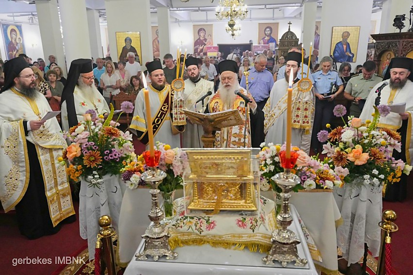 Ακολούθησε Ιερά Λιτανεία πέριξ του Ιερού Ναού με τη συμμετοχή της αδελφότητος της Ιεράς Μονής, κληρικών της Ιεράς Μητροπόλεως μας, τοπικών πολιτικών και στρατιωτικών αρχών και πλήθος ευσεβών πιστών που κατέκλυσαν ασφυκτικά τον πανηγυρίζοντα Ιερό Ναό.