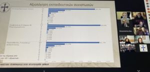Στη συνέχεια μίλησε ο κ. Κωνσταντίνος Καλτσάς, Υπεύθυνος της Πράξης και Επιστημονικός Σύμβουλος του Ι.Π.Ε., ο οποίος παρουσίασε την αξιολόγηση της Πράξης. Συγκεκριμένα ανέφερε ότι τα επιμορφωτικά προγράμματα αξιολογήθηκαν από τους συμμετέχοντες επιμορφούμενους μέσω ερωτηματολογίου που συμπλήρωναν στο τέλος των επιμορφωτικών προγραμμάτων που παρακολουθούσαν. Συνολικά συμπληρώθηκαν 4.700 ερωτηματολόγια εκ των οποίων το 60% αξιολόγησε τα επιμορφωτικά προγράμματα με 10/10, το 25% με 9/10, το 10% με 8/10 και το 3% με 7/10, δείχνοντας την επιτυχία που σημείωσε η Πράξη.