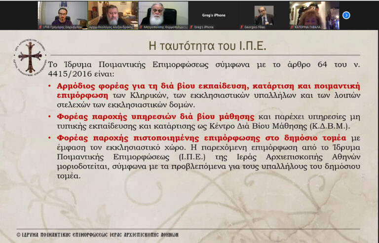 Σε κλίμα συγκίνησης και με αισθήματα χαράς και ικανοποίησης πραγματοποιήθηκε την Τετάρτη 15 Δεκεμβρίου η διαδικτυακή καταληκτήρια εκδήλωση των επιμορφωτικών προγραμμάτων των ετών 2017-2021 του Ιδρύματος Ποιμαντικής Επιμορφώσεως της Ιεράς Αρχιεπισκοπής.