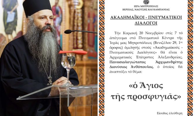 Τήν Κυριακή 20 Νοεμβρίου στίς 7 τό ἀπόγευμα στό Πνευματικό Κέντρο τῆς Ἱερᾶς Μητροπόλεως Βεροίας (Βενιζέλου 29, 1ος ὄροφος) ὁμιλητής στούς «Ἀκαδημαϊκούς – Πνευματικούς Διαλόγους» θά εἶναι ὁ Ἀρχιερατικός Ἐπίτροπος Ἀλεξανδρείας, Πανοσιολογιώτατος Ἀρχιμανδρίτης Διονύσιος Ἀνθόπουλος, ὁ ὁποῖος θά ἀναπτύξει τό θέμα: «ὁ Ἅγιος τῆς προσφυγιᾶς».
