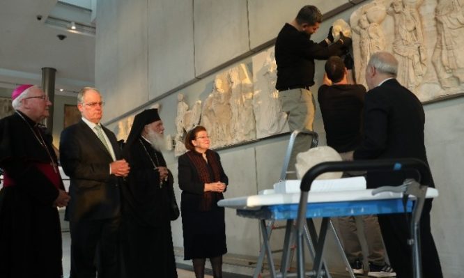 Σε κλίμα χαράς και συγκίνησης πραγματοποιήθηκε την Παρασκευή 24 Μαρτίου στο Μουσείο Ακρόπολης, στην Αίθουσα του Παρθενώνα, η απόδοση των τριών θραυσμάτων από τις μετόπες, τη ζωφόρο και τα αετώματα του Παρθενώνα, που επιστράφηκαν από τα Μουσεία του Βατικανού, στο μνημείο στο οποίο ανήκουν, τον Παρθενώνα.