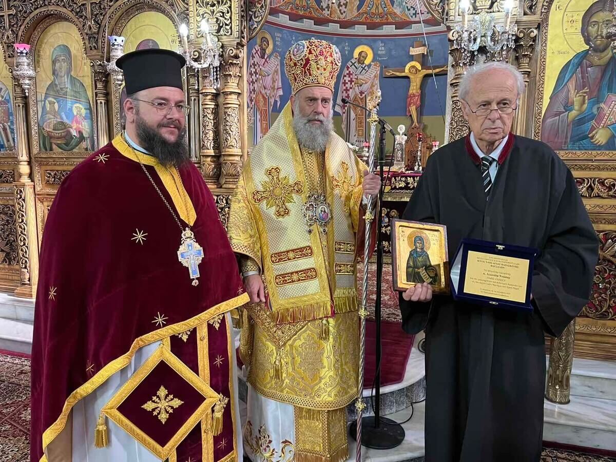 Προ της Απολύσεως τίμησε τον απερχόμενο πολιό ιεροψάλτη του Ιερού Ναού κ. Λεωνίδα Ντάσιο για την πολυετή του διακονία στον δεξιό ιερό Ψαλτήρα.