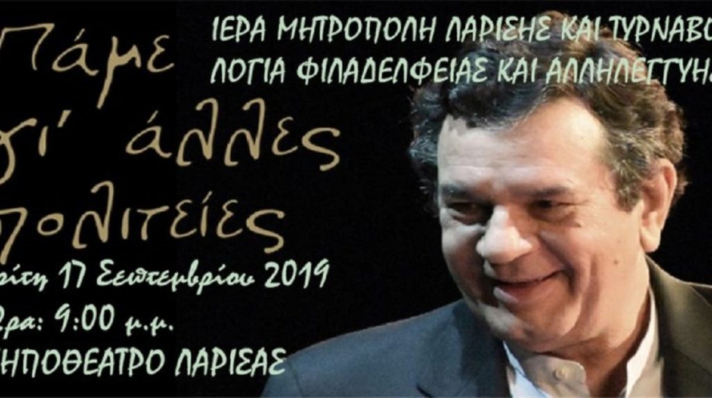 Στο Κηποθέατρο Λαρίσης, την Τρίτη 17 Σεπτεμβρίου 2019 και ώρα 21.00΄ μ.μ, η Ιερά Μητρόπολη Λαρίσης και Τυρνάβου, με την ευκαιρία της ενάρξεως της νέας ακαδημαϊκής και πνευματικής χρονιάς, και στα πλαίσια της φιλανθρωπικής και ποιμαντικής μέριμνας της, διοργανώνει μία συναυλία με έργα του παγκοσμίου εμβελείας Καλλιτέχνη κ. Σταμάτη Σπανουδάκη, ο οποίος θα παρουσιάσει το πρόγραμμα του με τίτλο: «Πάμε γι΄ άλλες πολιτείες!».