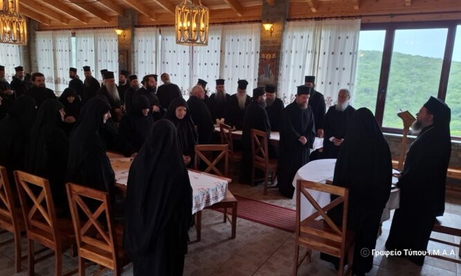 «Όλοι μας αυτή τη στιγμή είμαστε μοναχοί και προσπαθούμε ο καθένας με το δικό του τρόπο και με τις δικές του δυνάμεις να ανταποκριθούμε στις υποσχέσεις που δώσαμε κατά τη μοναχική μας κουρά. Όλοι μας έχουμε ακολουθήσει την ισάγγελη πολιτεία και απολαμβάνουμε το προνόμιο να έχουμε όλη μας τη ζωή στραμμένη μόνο στο Χριστό. Σε Εκείνον ανήκουμε ολοκληρωτικά και δεν θα πρέπει να υπάρχει τίποτα πάνω από την αγάπη του Χριστού. Γι’ αυτή την αγάπη του Χριστού πρέπει να είμαστε έτοιμοι να θυσιάσουμε τα πάντα και να θυσιαζόμαστε καθημερινά με τον τρόπο που ο καθένας μπορεί και γνωρίζει» ανέφερε ο Σεβασμιώτατος και ευχήθηκε αυτή η Σύναξη να γίνει θεσμός και να πραγματοποιείται κάθε χρόνο. Τέλος εξέφρασε τη χαρά του για την απόφαση της Ιεράς Κοινότητος του Αγίου Όρους να εγκρίνει την έλευση της Ιεράς Εικόνος του «Άξιον Εστί» για τους εορτασμούς των 200 ετών από την Έξοδο του Μεσολογγίου.