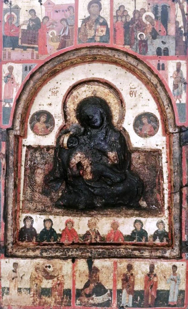 Ἡ εἰκόνα εἶναι ἀνάγλυφη, φιλοτεχνημένη ἀπό τό θεοκίνητο χέρι τοῦ Εὐαγγελιστή Λουκᾶ μέ τήν ἐγκαυστική τεχνική, μέ κερί δηλαδή, μαστίχα καί ἄλλες χρωστικές ὕλες. Ἡ εἰκόνα παρέμεινε στό ἀπομακρυσμένο σπήλαιο μέχρι πού ἀνακαλύφθηκε κατά θαυμαστό τρόπο καί κατόπιν ὁράματος ἀπό τήν ποιμενίδα ἁγία Εὐφροσύνη καί τούς αὐταδέλφους Θεσσαλονικεῖς κτίτορες τῆς Ἱερᾶς Μονῆς Συμεών καί Θεόδωρο. Στόν ἴδιο ἀκριβῶς χῶρο, τῆς εὑρέσεως δηλαδή τῆς ἱερᾶς εἰκόνος, ἀνεγέρθηκε ἡ περίφημη Μονή τοῦ Μεγάλου Σπηλαίου στά μέσα τοῦ 4ου μ.Χ. αἰῶνος (362 μ.Χ.). Εἶναι ἴσως ἡ ἀρχαιότερη χριστιανική Μονή σέ ὁλόκληρο τόν Ἑλλαδικό χῶρο, μαζί μέ τήν ἱερά Μονή Παναγίας «Εἰκοσιφοινίσσης» στήν Δράμα.