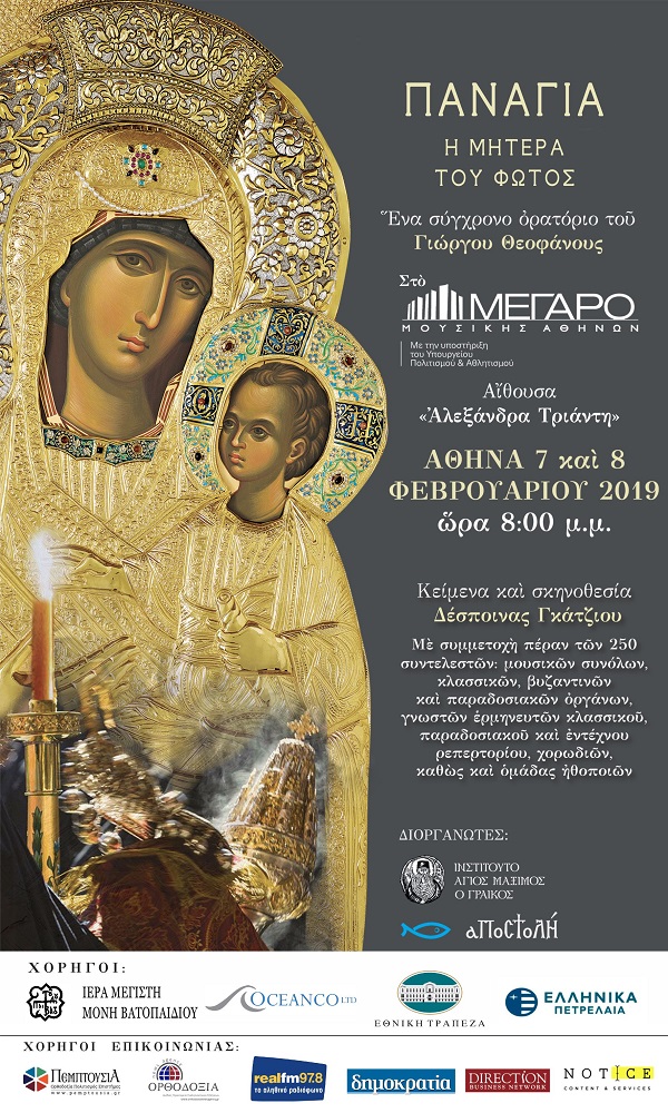 Η «ΑΠΟΣΤΟΛΗ» και ο «Άγιος Μάξιμος ο Γραικός», με την ευγενική υποστήριξη της Ιεράς Μεγίστης Μονής Βατοπαιδίου, θα παρουσιάσουν σε δύο παραστάσεις στην αίθουσα «Αλεξάνδρα Τριάντη», του Μεγάρου Μουσικής Αθηνών στις 7 και 8 Φεβρουαρίου, στις 8 το βράδυ, ένα σύγχρονο ορατόριο για την Παναγία του συνθέτη Γιώργου Θεοφάνους, σε κείμενα και σκηνοθεσία της Δέσποινας Γκάτζιου.