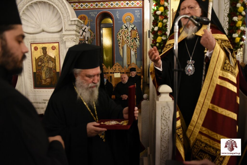 Σήμερα, ὅμως, στό πάνσεπτο πρόσωπό Σας ὑποδεχόμαστε καί σύμπασα τή Με¬γάλη τοῦ Χριστοῦ Ἐκκλησία, τήν ἄφθαρτη κιβωτό καί τόν ἀειφεγγῆ φάρο τῆς ἀμωμήτου ἡμῶν πίστεως καί τῶν Ἀποστολικῶν καί Πατερικῶν παραδόσεων, πρός τήν ὁποία ἡ Ἐκκλησία τῆς Ἑλλάδος ἔχει πάντοτε τά βλέμματα στραμμένα. Γιατί ποιός μπορεῖ νά ἀρνηθεῖ ὅτι ὁ Ἑλληνισμός θά ἦταν μιά κουκίδα στόν χάρτη τῆς Ἀνθρωπότητας χωρίς τό Οἰκουμενικό Πατριαρχεῖο; Ἡ πρωτόθρονη Ἐκκλησία πλανητοποιεῖ τό Γένος, δίδει διάσταση καί ἔκφραση ὑπερφυλετική καί χαρίζει κλώνους καί βλαστούς καί κυρίως κορμό στό κοσμικό δένδρο τοῦ Πνεύματος.