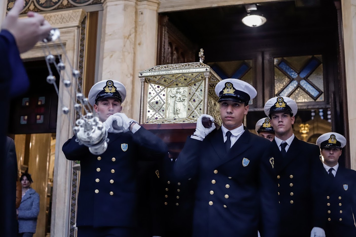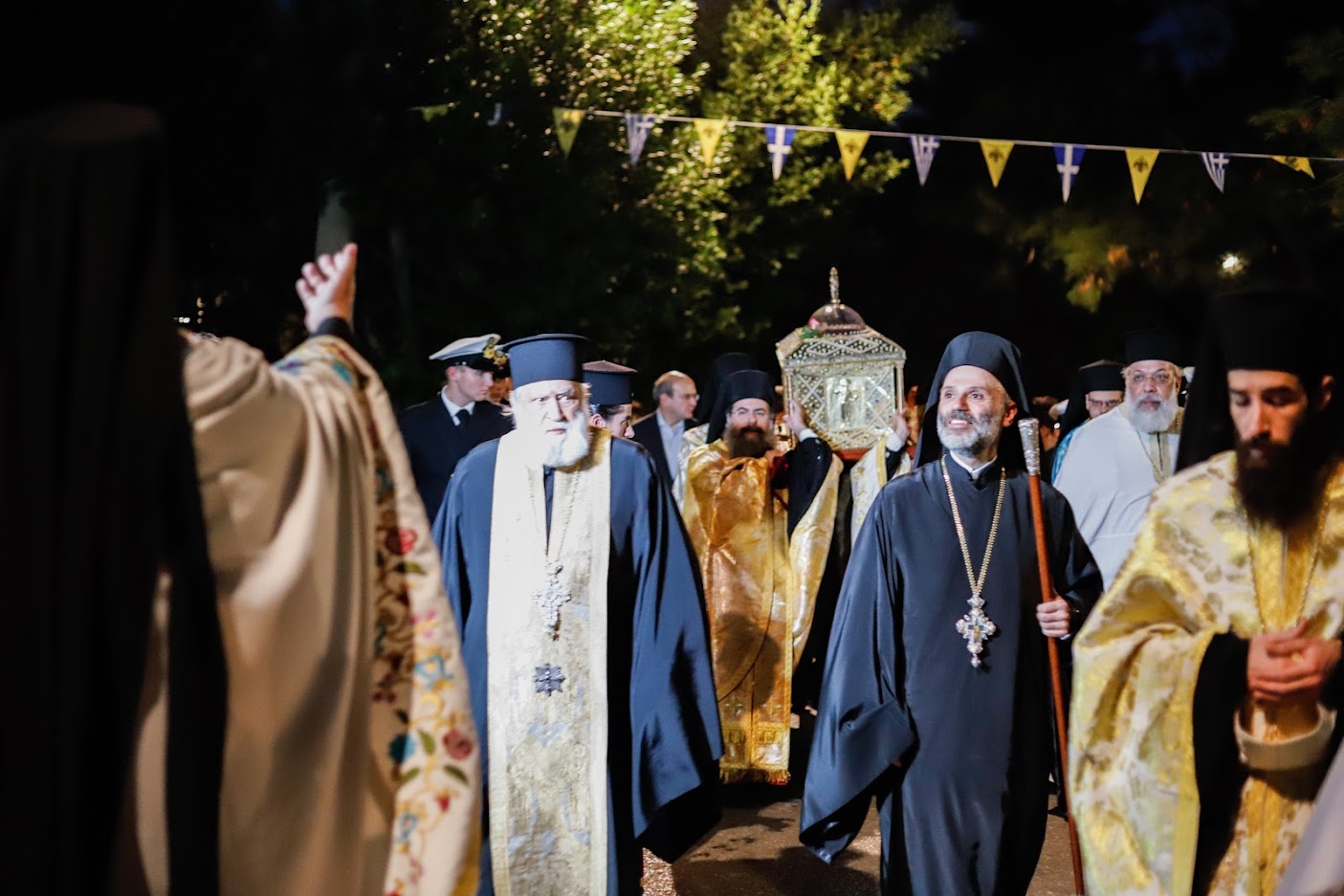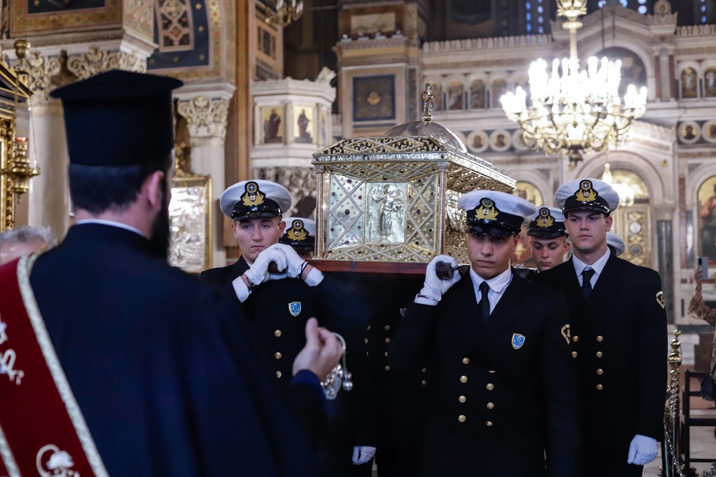 Το ιερό σκήνωμα μεταφέρθηκε με στρατιωτικό όχημα και συνόδευσε ο Προϊστάμενος του Μητροπολιτικού Ναού Αθηνών, Αιδεσιμολ. Πρωτοπρεσβύτερος κ. Θωμάς Συνοδινός. Στην υποδοχή παρέστησαν οι Σεβασμιώτατοι Μητροπολίτες Κηφισίας, Αμαρουσίου, Ωρωπού και Μαραθώνος κ. Κύριλλος, Νέας Ιωνίας, Φιλαδελφείας, Ηρακλείου και Χαλκηδόνος κ. Γαβριήλ και Θεσσαλιώτιδος και Φαναριοφερσάλων κ. Τιμόθεος, ο Υπουργός Εργασίας και Κοινωνικών Υποθέσεων κ. Κωστής Χατζηδάκης, η Υφυπουργός Υγείας κ. Ζωή Ράπτη, ο κ. Γιώργος Κουμουτσάκος Βουλευτής ΝΔ, ο Δήμαρχος Φιλοθέης – Ψυχικού κ. Δημήτρης Γαλάνης, εκπρόσωποι των Ενόπλων Δυνάμεων και των Σωμάτων Ασφαλείας, τοπικών Συλλόγων και Φορέων, κλήρος και λαός.