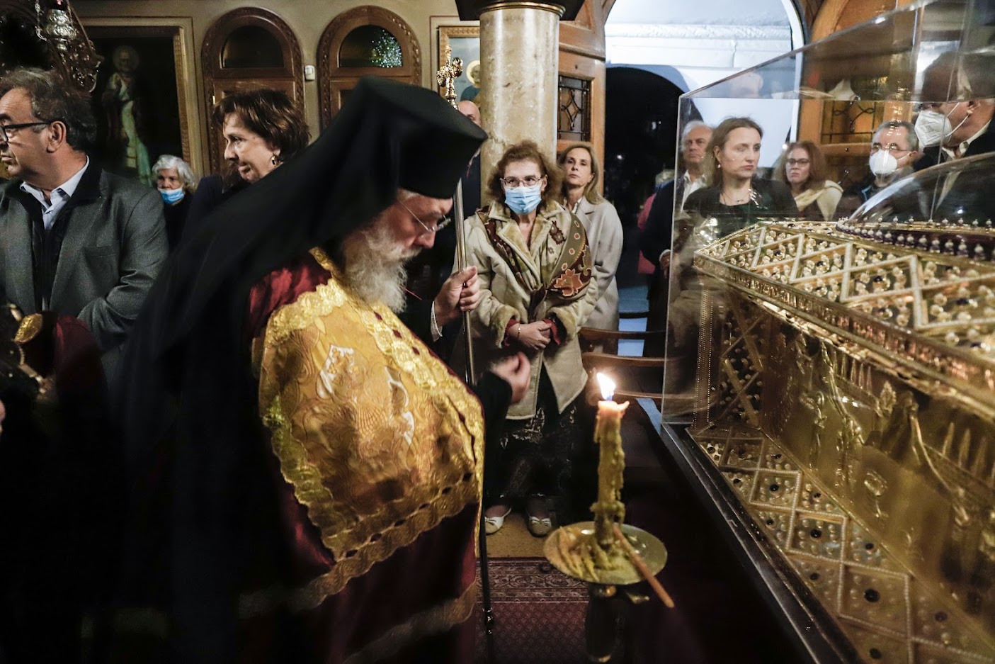 Το ιερό σκήνωμα μεταφέρθηκε με στρατιωτικό όχημα και συνόδευσε ο Προϊστάμενος του Μητροπολιτικού Ναού Αθηνών, Αιδεσιμολ. Πρωτοπρεσβύτερος κ. Θωμάς Συνοδινός. Στην υποδοχή παρέστησαν οι Σεβασμιώτατοι Μητροπολίτες Κηφισίας, Αμαρουσίου, Ωρωπού και Μαραθώνος κ. Κύριλλος, Νέας Ιωνίας, Φιλαδελφείας, Ηρακλείου και Χαλκηδόνος κ. Γαβριήλ και Θεσσαλιώτιδος και Φαναριοφερσάλων κ. Τιμόθεος, ο Υπουργός Εργασίας και Κοινωνικών Υποθέσεων κ. Κωστής Χατζηδάκης, η Υφυπουργός Υγείας κ. Ζωή Ράπτη, ο κ. Γιώργος Κουμουτσάκος Βουλευτής ΝΔ, ο Δήμαρχος Φιλοθέης – Ψυχικού κ. Δημήτρης Γαλάνης, εκπρόσωποι των Ενόπλων Δυνάμεων και των Σωμάτων Ασφαλείας, τοπικών Συλλόγων και Φορέων, κλήρος και λαός.