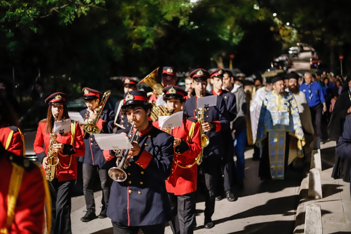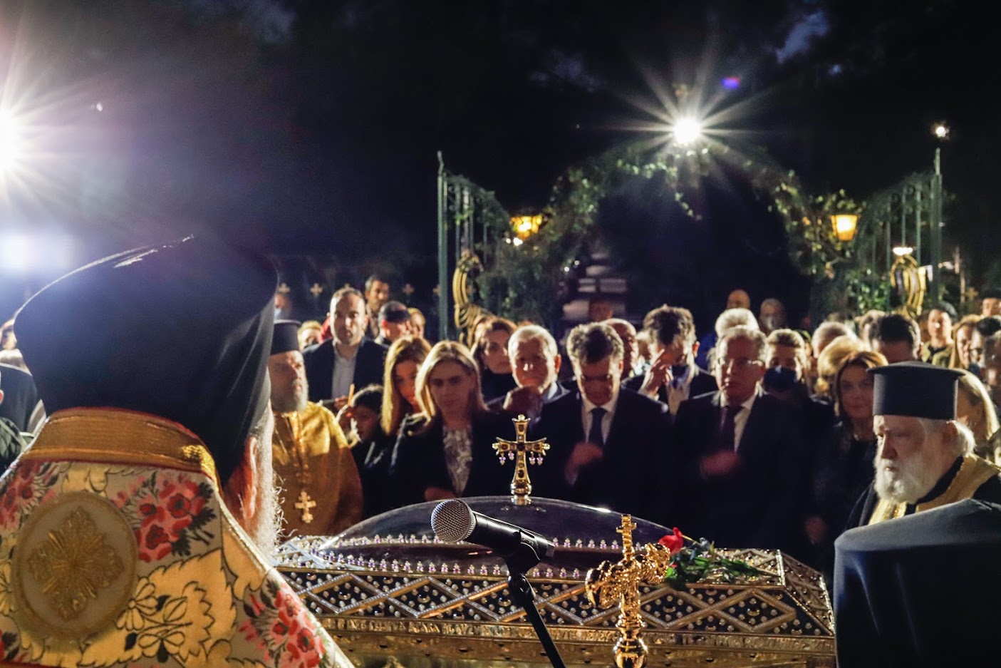 Έπειτα από μία σύντομη δέηση στην «Κρύπτη», υπό τον ήχο της Φιλαρμονικής του Δήμου Φιλοθέης – Ψυχικού και την συνοδεία αγήματος του Λιμενικού Σώματος, Προσκόπων από το 1ο Σύστημα Προσκόπων Φιλοθέης, Αεροπροσκόπων από το 2ο Σύστημα Αεροπροσκόπων Φιλοθέης, Οδηγών από το Σώμα Ελληνικού Οδηγισμού Φιλοθέης και ενοριτών-εθελοντών με παραδοσιακές ενδυμασίες, η λάρνακα λιτανεύθηκε από τον Καθηγούμενο Πανοσιολ. Αρχιμ. κ. Γρηγόριο Λιέπουρη και ιερομόναχους της Ιεράς Μονής Εισοδίων της Θεοτόκου – Αγίας Φιλοθέης Αμαρουσίου και τοποθετήθηκε στο κέντρο του Ναού. Αμέσως μετά τελέσθηκε ο Μέγας Αρχιερατικός Εσπερινός, χοροστατούντος του Σεβ. Μητροπολίτου Κηφισίας και συγχοροστατούντος του Σεβ. Θεσσαλιώτιδος. Ο κ. Κύριλλος στην ομιλία του αναφέρθηκε στην θέση της γυναίκας την εποχή που έζησε και έδρασε η Αγία Φιλοθέη, τονίζοντας ότι η Εκκλησία εξύψωσε την γυναίκα στο πρόσωπο της Παναγίας, η οποία κατέχει τα δευτερία της Τριάδος. Σημείωσε, επίσης, ότι η Εκκλησία τιμώντας την Αγία Φιλοθέη αποδεικνύει ότι η χριστιανή γυναίκα μπορεί να μεταμορφώσει την κοινωνία μέσα από τα έργα αγάπης και προσφοράς, όπως η Αγία στην εποχή της. Ακόμη, έκανε ιδιαίτερη αναφορά στο φιλανθρωπικό έργο και την κοινωνική προσφορά της Αγίας και ευχήθηκε «η Αγία Φιλοθέη να μας χαρίζει δύναμη και υγεία και να στερεώνει την πίστη μας, ώστε να ανταπεξέλθουμε στις δυσκολίες των καιρών».