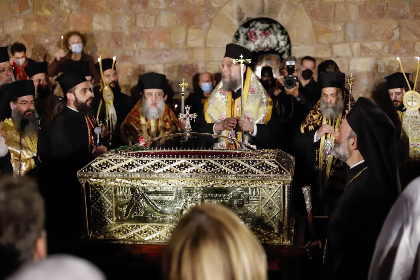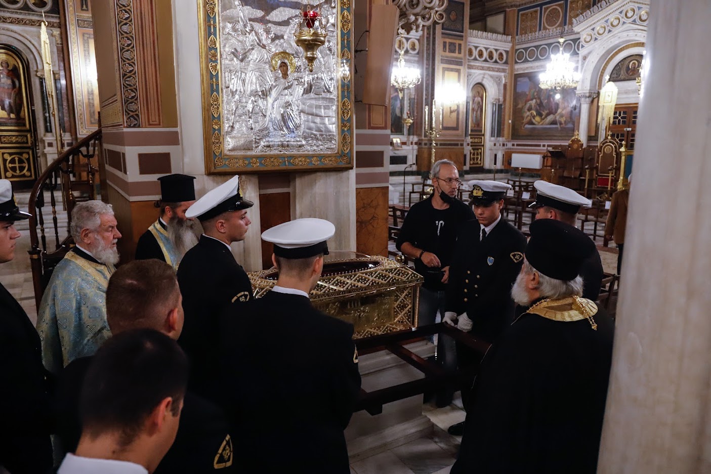 Το ιερό σκήνωμα μεταφέρθηκε με στρατιωτικό όχημα και συνόδευσε ο Προϊστάμενος του Μητροπολιτικού Ναού Αθηνών, Αιδεσιμολ. Πρωτοπρεσβύτερος κ. Θωμάς Συνοδινός. Στην υποδοχή παρέστησαν οι Σεβασμιώτατοι Μητροπολίτες Κηφισίας, Αμαρουσίου, Ωρωπού και Μαραθώνος κ. Κύριλλος, Νέας Ιωνίας, Φιλαδελφείας, Ηρακλείου και Χαλκηδόνος κ. Γαβριήλ και Θεσσαλιώτιδος και Φαναριοφερσάλων κ. Τιμόθεος, ο Υπουργός Εργασίας και Κοινωνικών Υποθέσεων κ. Κωστής Χατζηδάκης, η Υφυπουργός Υγείας κ. Ζωή Ράπτη, ο κ. Γιώργος Κουμουτσάκος Βουλευτής ΝΔ, ο Δήμαρχος Φιλοθέης – Ψυχικού κ. Δημήτρης Γαλάνης, εκπρόσωποι των Ενόπλων Δυνάμεων και των Σωμάτων Ασφαλείας, τοπικών Συλλόγων και Φορέων, κλήρος και λαός.