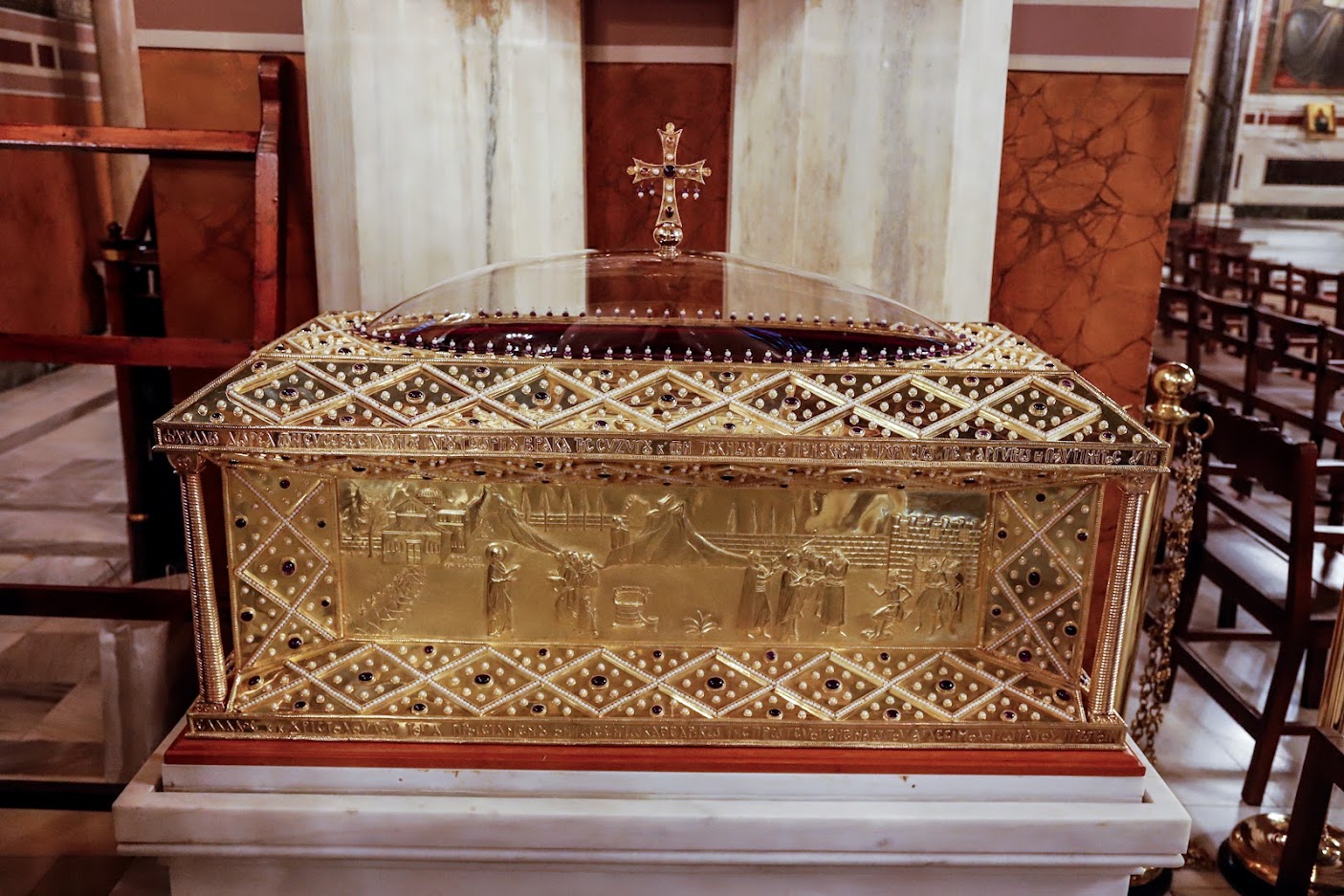 Η επίσημη υποδοχή του πραγματοποιήθηκε χθες Κυριακή 20 Νοεμβρίου, στον τόπο προσευχής της Αγίας, την επονομαζόμενη «Κρύπτη της Αγίας Φιλοθέης», η οποία συνδεόταν μέσω υπόγειας σήραγγας 300 μέτρων με το Μετόχι των Εισοδίων της Θεοτόκου Αμαρουσίου. Στο Μετόχι που η Αγία έζησε κατά τους τελευταίους μήνες της ζωής της, εκοιμήθη και ετάφη και εκ του οποίου το άφθαρτο και μυροβλύζον ιερό λείψανό της μετεκομίσθη το 1591 στο Καθολικό της Ιεράς Μονής Αποστόλου Ανδρέου Αθηνών και εξ αυτού στον Μητροπολιτικό Ναό Αθηνών το 1862.