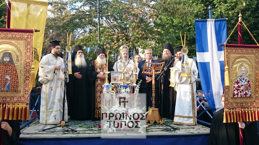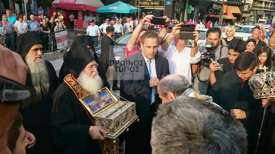 Το ιερό θησαύρισμα υποδέχθηκε ο Σεβασμιώτατος Μητροπολίτης Δράμας κ. Παύλος στη πλατεία Ελευθερίας, παρουσία Αγήματος της Φρουράς Δράμας, τοπικών στρατιωτικών και πολιτικών αρχών, του ιερού κλήρου και πλήθους ευσεβούς λαού.