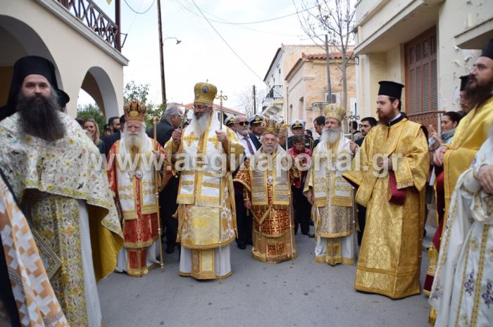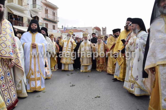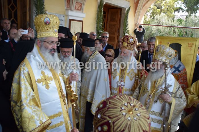 Νωρίτερα, στον ιερό ναό του Αγίου Νεκταρίου στην Αίγινα είχε τελεστεί ο όρθρος και η αρχιερατική Θεία Λειτουργία, μετά την ολοκλήρωση της οποίας, οι αρχιερείς, οι επίσημοι, ο κλήρος και οι προσκυνητές, κατήλθαν με αυτοκινητοπομπή στο κέντρο της Αίγινας, στην περιοχή του Καποδιστριακού Ορφανοτροφείου και του Δημοτικού Σταδίου Αίγινας.