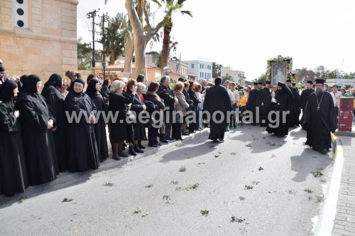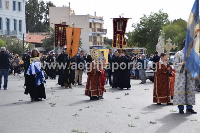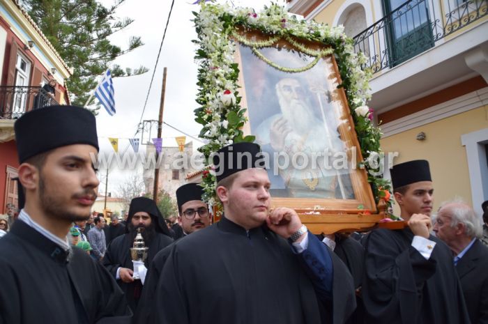 Η λιτανευτική πομπή ξεκίνησε από το Δημοτικό Στάδιο Αίγινας, με τους κατοίκους και τους επισκέπτες – προσκυνητές του νησιού να βρίσκονται παρατεταγμένοι στην δεξιά και την αριστερή πλευρά του δρόμου. Οι υπάλληλοι του Δήμου Αίγινας είχαν ράνει με δάφνες το δρόμο από όπου θα περνούσε η πομπή, ενώ όργανα από το αστυνομικό τμήμα Αίγινας φρόντισαν από νωρίς το πρωί προκειμένου να κυλήσουν όλα ομαλά.