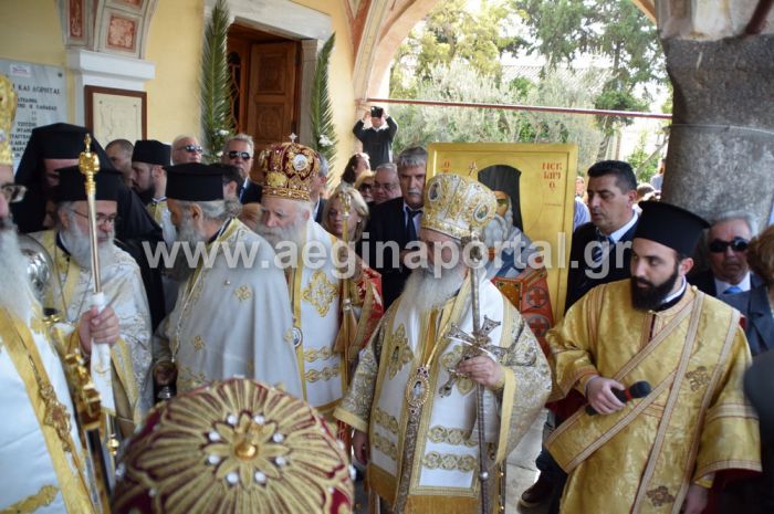 Στον ενοριακό ναό της «Παναγίτσας» οι κυρίες έραναν με άνθη την εικόνα και την Τιμία Κάρα, όταν η πομπή σταμάτησε προκειμένου να γίνει δέηση. Δέηση έγινε επίσης στο χώρο κοντά στο κτίριο του παλιού δημαρχείου. Στην παραλία της Αίγινας, τιμές απέδωσαν τα πλοία της γραμμής και το υπερσύγχρονο ταχύπλοο «Γαύδος» που παρέλαβε το Λιμενικό Σώμα.