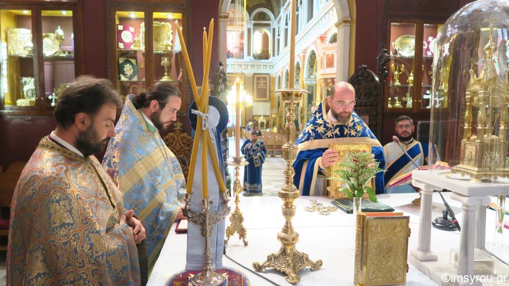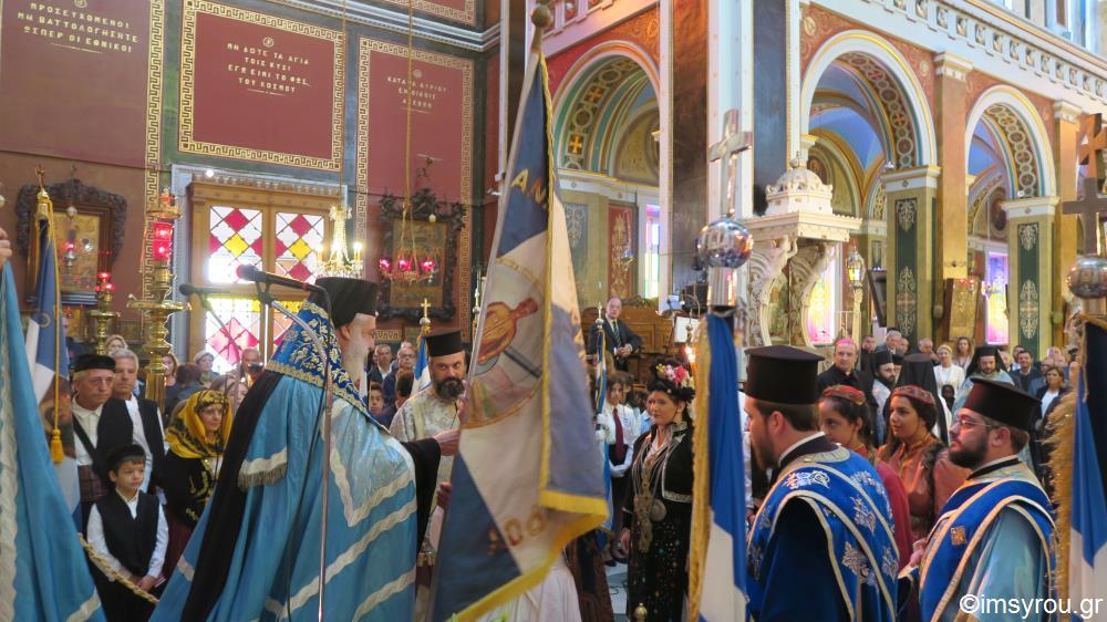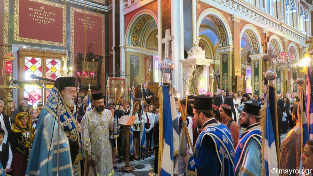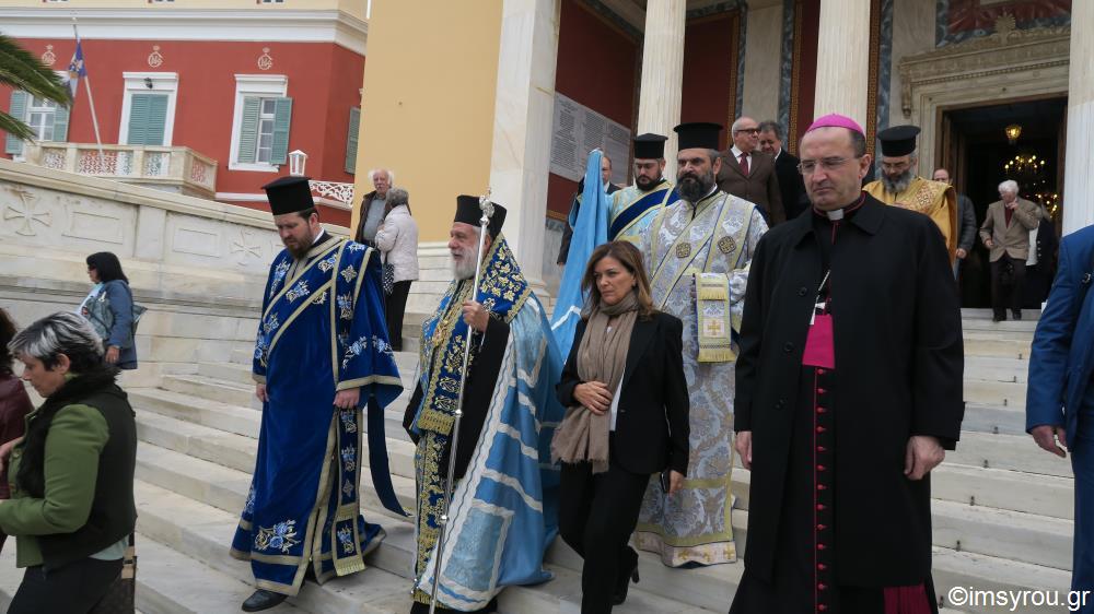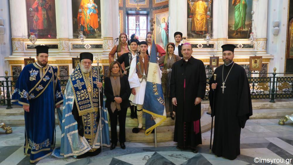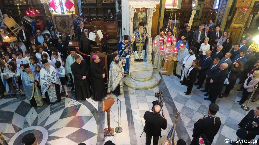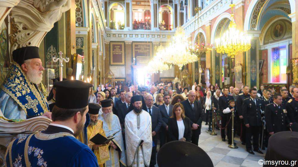 Στη Θεία Λειτουργία και τη Δοξολογία στην Ερμούπολη χοροστάτησε ο Σεβ. κ.Δωρόθεος β΄, παρουσία της εκπροσωπούσης την Κυβέρνηση , Αναπληρώτριας Υπουργού Εργασίας , και Κοινωνικής Ασφάλισης και Κοινωνικής Αλληλεγγύης κυρίας Ουρανίας Αντωνοπούλου, του Επισκόπου των εν Σύρω Ρω/καθολικών κ. Πέτρου Στεφάνου , του Βουλευτή ΣΥΡΙΖΑ κυρίου Συρίγου , του χωρικού Αντιπεριφερειάρχου Κυκλάδων κ. Λεονταρίτη, του Δημάρχου Σύρου-