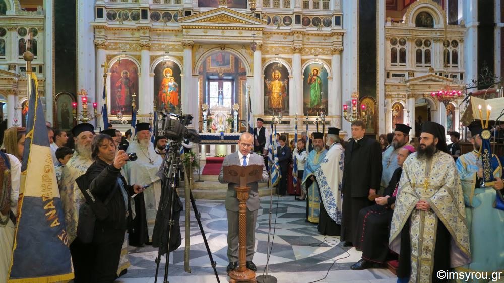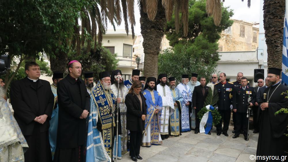 -Ερμούπολης κ. Μαραγκού , της Πολιτευτού Κυκλάδων Ν.Δ κυρίας Μονογιού, Περιφερειακών και Δημοτικών Συμβούλων , των επικεφαλής εν Σύρω του Στρατού ,του Ναυτικού και των Σωμάτων Ασφαλείας ,του επι τιμή Νομάρχη κ. Μπαίλα , εκπαιδευτικών και μαθητών όλων των βαθμίδων με τις Σημαίες, Σπουδαστών της Σχολής Εμποροπλοιάρχων , μελών πατριωτικών φορέων και Συλλόγων, των προσκόπων μελών του Λυκείου Ελληνίδων και του ιερού Κλήρου.